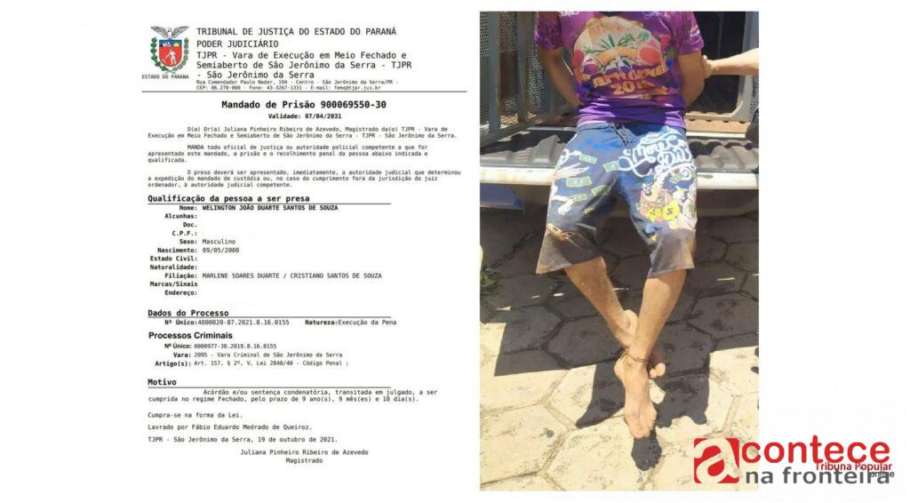 Depois de dominada a situação este teve seu nome pesquisado junto ao sistema informatizado da central de operações e constatado também haver contra este um mandado de prisão expedido pela Vara de Execução em Meio Fechado e Semiaberto da comarca de São Jerônimo da Serra/PR.