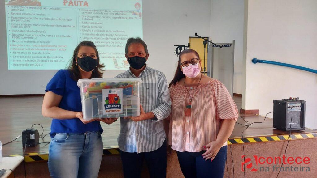 A entrega simbólica para as primeiras unidades escolares foi feita ontem (19) pelo prefeito Chico Brasileiro e a secretária de educação, Maria Justina da Silva, durante uma reunião com diretoras e diretores no SEST/SENAT. Receberam os kits a diretora do CMEI Celeste Sottomaior, Maristela dos Santos, e a diretora da Escola Jardim Naipi, Marinelma Fátima Legnaghi. As demais instituições estão retirando os livros na sede da secretaria, no Complexo Bordin.