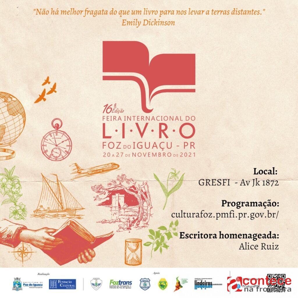 A Fundação Cultural de Foz do Iguaçu divulgou a programação da 16ª Feira Internacional do Livro, que será realizada de 20 a 27 de novembro, no Clube Gresfi. A escritora homenageada será a poetisa paranaense Alice Ruiz, que fará a abertura do evento no sábado (20).
