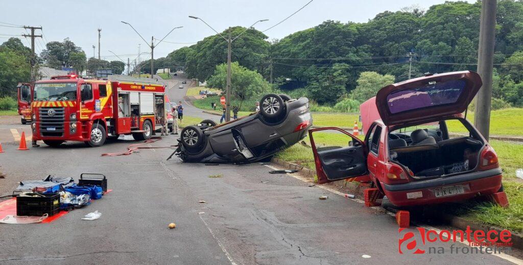 No local foi constatado a colisão do veículo Kia / Sportage, de cor cinza, de placas paraguaias BVZ-662, que trafegava pela Rua Carlos Souto Maior (Jupira) e quando foi acessar a Avenida Tancredo Neves, colidiu violentamente no veículo Ford / Fiesta, de cor vermelho, de placas AJX-4718 de Foz do Iguaçu que trafegava pela Av. Tancredo Neves.