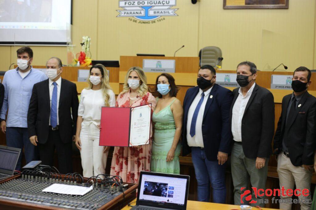 Durante uma sessão solene da Câmara Municipal de Foz do Iguaçu nesta segunda-feira (20), a ex-governadora do Estado do Paraná e conselheira da Itaipu Binacional, Cida Borghetti, recebeu o título de Cidadã Honorária da cidade. A solenidade contou com a presença do prefeito Chico Brasileiro, do deputado federal e líder do governo federal Ricardo Barros, entre outras autoridades municipais e estaduais.