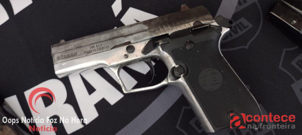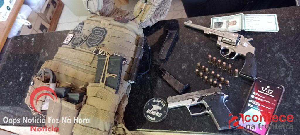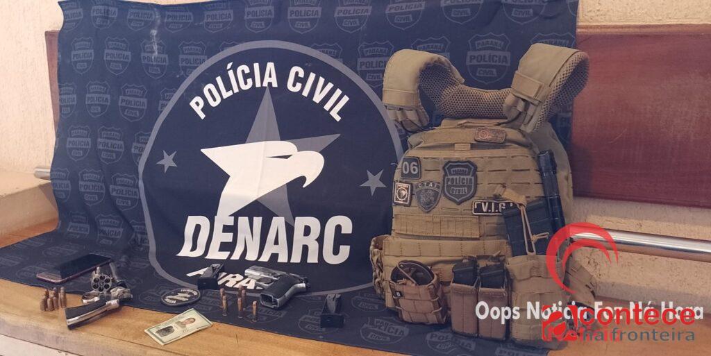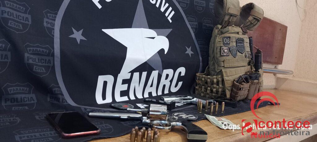 Na casa do abordado foram localizados duas armas de fogo, sendo uma pistola e um revolver, ambos municiados.As armas e o preso foram inicialmente encaminhados para a sede do DENARC, onde foi autuado em flagrante, sendo comunicado o Poder Judiciário o cumprimento do mandado de prisão, e posteriormente encaminhado para a Cadeia Pública Laudemir Neves.
