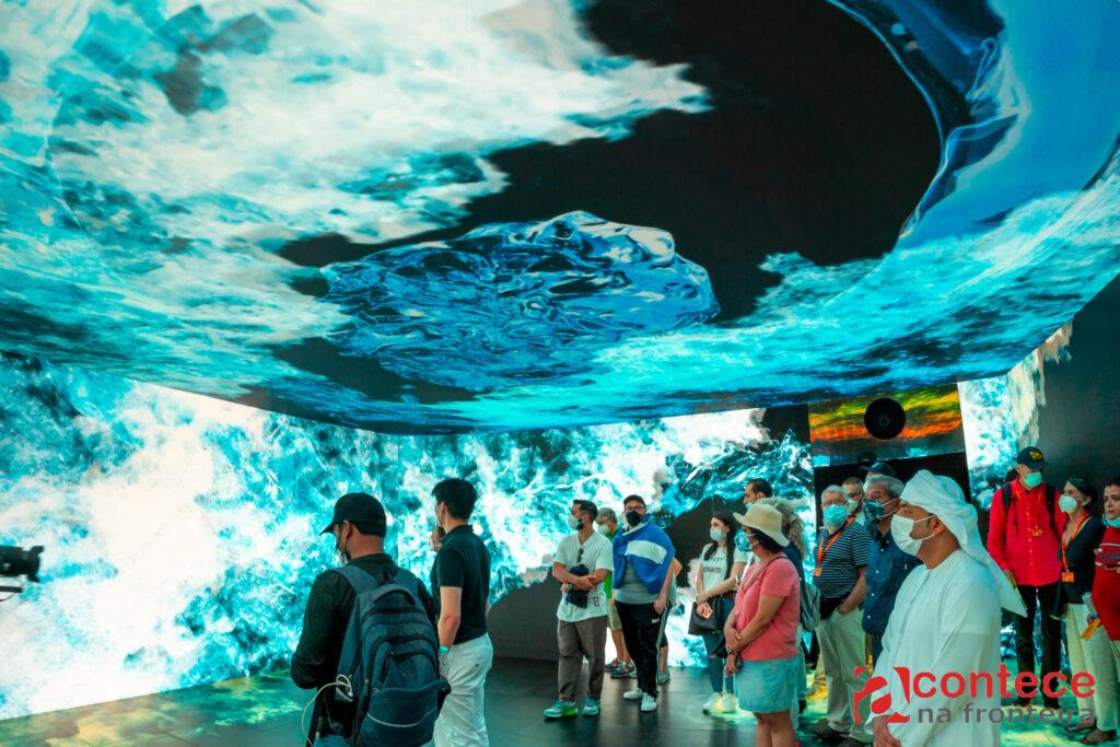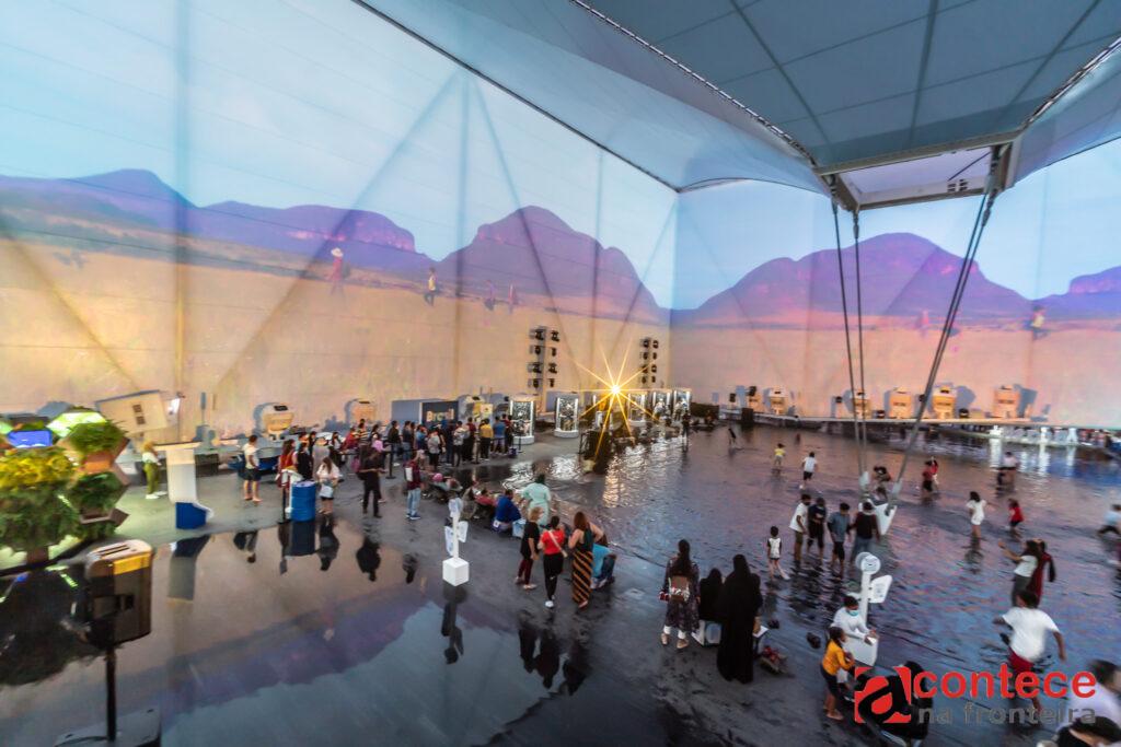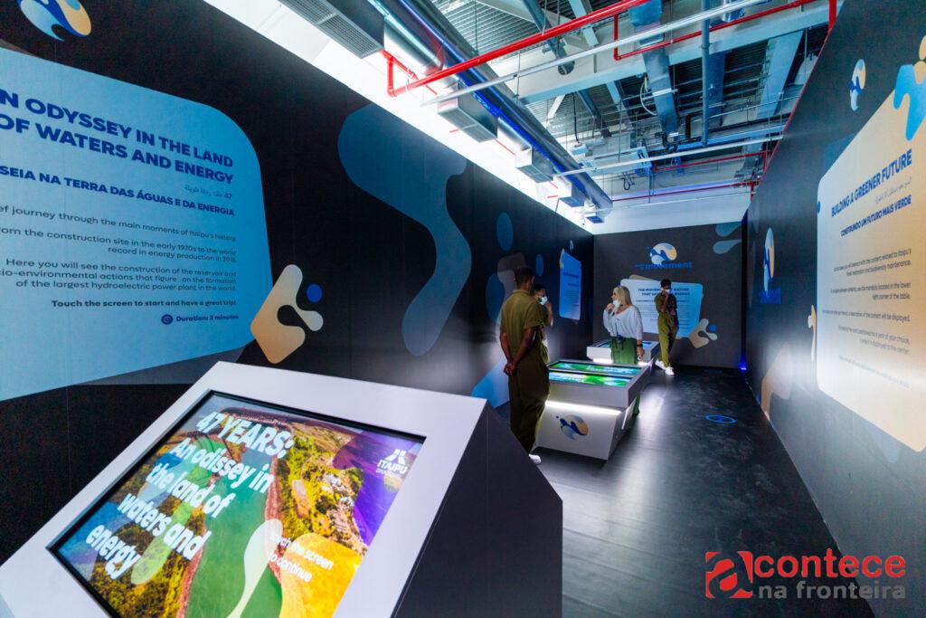 Ao longo do dia, também foi grande a movimentação, que pode ser percebida pelas filas desde a entrada do pavilhão. Logo que chega, o visitante passa por uma instalação que remete aos rios voadores, que é como se chama a conexão entre os biomas brasileiros por meio das chuvas. Ali, ouve explição sobre como se dá essa conexão pela água. A seguir, por meio de um totem, as pessoas recebem as boas-vindas com informações gerais sobre a Itaipu e Foz do Iguaçu.