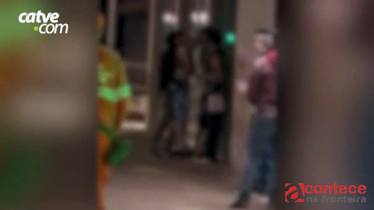 O vídeo, que circula nas redes sociais, mostra os dois rapazes na calçada na Avenida Brasil. Ato aconteceu perto da esquina com a rua Pio XII. Local é bastante frequentado por jovens, além de ser um dos pontos mais movimentados da cidade nos fins de semana.