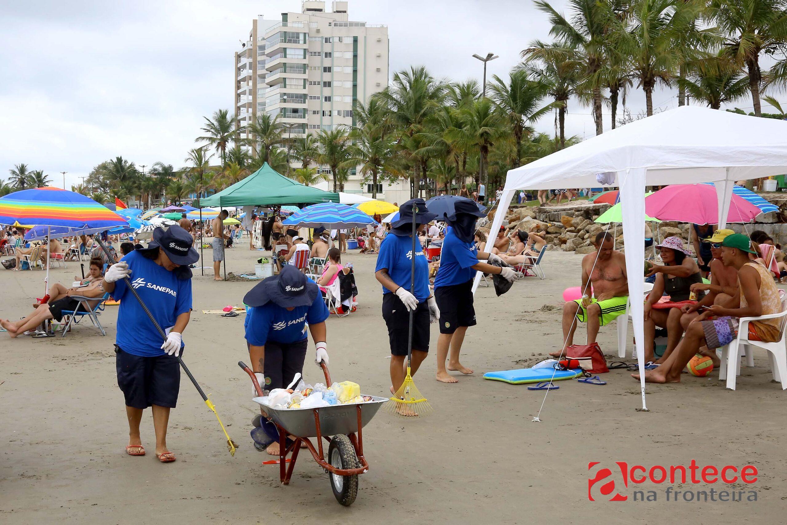 A limpeza tem sido feita diariamente em 48,6 quilômetros da orla por equipe contratada pela Sanepar. São 140 trabalhadores que varrem a areia, recolhem e separam resíduos sólidos.