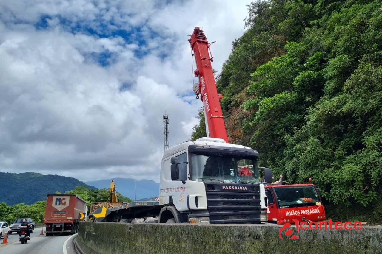 OBRAS DO DNIT – Com a retirada do guindaste no km 41, fica bloqueado no Litoral somente o km 33, atingido por fendas no pavimento e danos no talude de aterro. O DNIT será responsável pela obra, e atualmente prepara contratação emergencial.