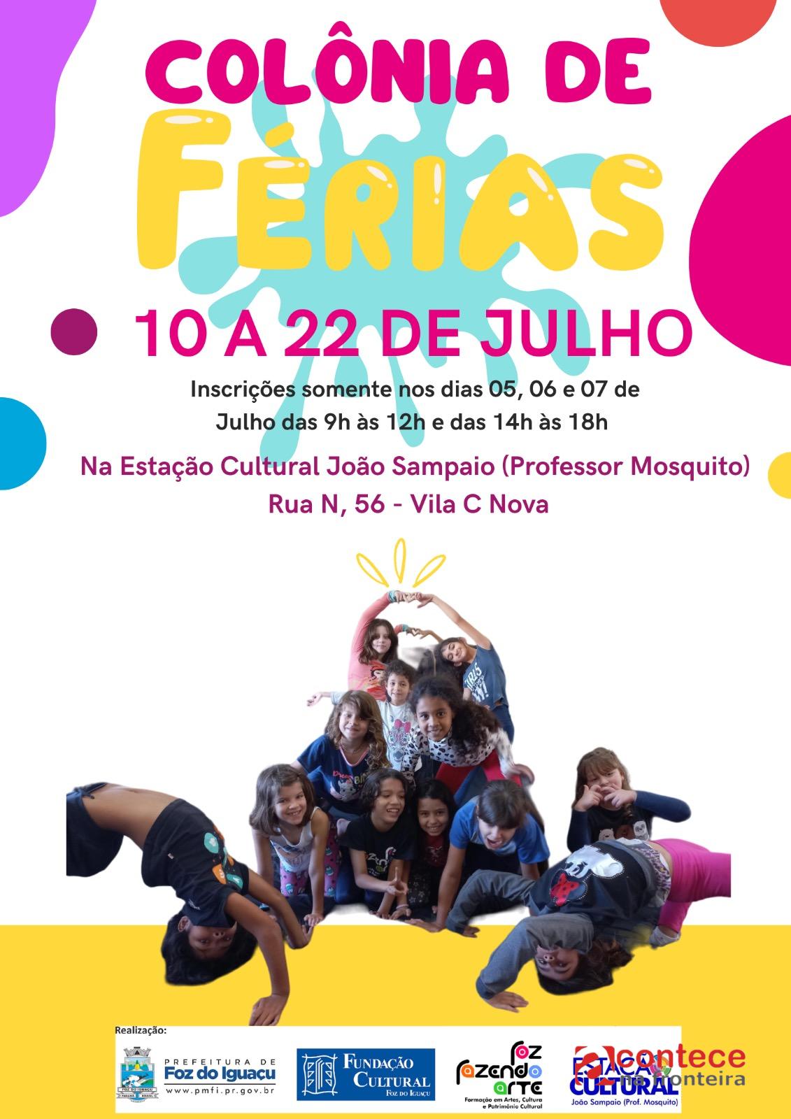 A Estação Cultural João Sampaio, na Vila C, promove de 10 a 22 de julho a Colônia de Férias para crianças e adolescentes de 7 a 15 anos. As inscrições podem ser feitas nesta quarta, quinta e sexta-feira (05, 06 e 07) das 9h às 12h e das 14h às 18h de forma presencial, na Rua ‘N’, 56, ou através do WhatsApp 4598230538.