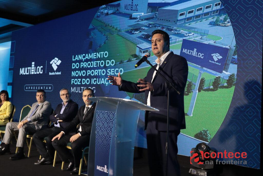 O governador Carlos Massa Ratinho Junior participou nesta quinta-feira (2) do lançamento do projeto do novo Porto Seco de Foz do Iguaçu, no Oeste do Paraná, que deve dobrar e modernizar a movimentação de cargas na tríplice fronteira entre Brasil, Paraguai e Argentina. A estrutura será construída pela empresa Multilog, que venceu a licitação promovida pela Receita Federal e já é responsável pela operação do atual porto seco do município.