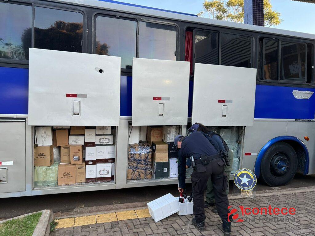 Na primeira abordagem, em ação conjunta com a Polícia Federal, um ônibus foi abordado na Serra do Mico, em São Miguel do Iguaçu. A operação resultou na apreensão de basicamente caixas de vinhos, além de perfumes e uma caixa contendo cerca de 30 kg de picanha procedentes da Argentina. O veículo, que transportava sete passageiros, com destino a São Paulo, foi encaminhado para a Sede da Receita Federal em Foz do Iguaçu para posterior fiscalização. As mercadorias apreendidas foram avaliadas em aproximadamente R$ 400 mil. Os passageiros foram liberados, já o motorista e seu ajudante foram presos em flagrante e encaminhados para a Polícia Federal.