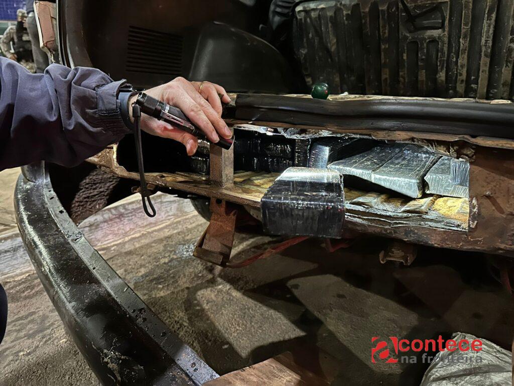 Durante a vistoria, os servidores da Receita Federal descobriram um fundo falso no assoalho traseiro do veículo, acessível através do para-choque. No compartimento oculto, foram encontrados 141 tabletes da substância.