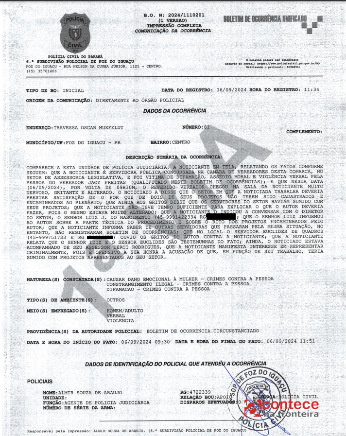 A servidora em questão esteve na 6ª SDP, onde registrou Boletim de Ocorrência, afirmando que foi vítima de difamação, assédio moral e violência verbal, tipificando como crime contra a pessoa, causando dano emocional e constrangimento ilegal.