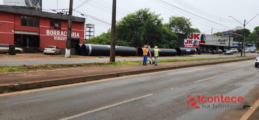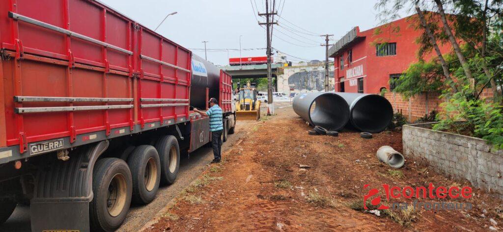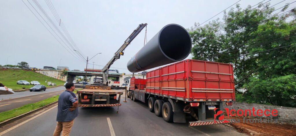 Para permitir a vazão de um grande fluxo de água serão utilizados tubos de PEAD (Polietileno de Alta Densidade) de alta densidade, com12 metros cada. Os materiais começaram a chegar nesta segunda-feira (14) a Foz do Iguaçu. “Devido ao tamanho dos tubos, apenas uma unidade é trazida por carreta. Serão 64 cargas de carreta para trazer todos os tubos necessários para a execução da obra”, explica o secretário Municipal de Obras, Luis Cezar Furlan.