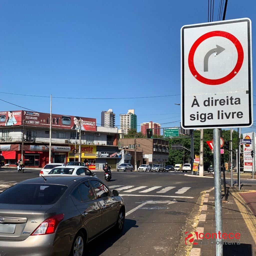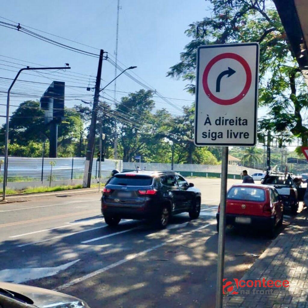 Na Avenida Paraná, próximo ao cruzamento com a Avenida das Cataratas e Jorge Schimmelpfeng, a conversão é livre para os veículos que vão acessar a Rua Estanislau Zambrzycki.
