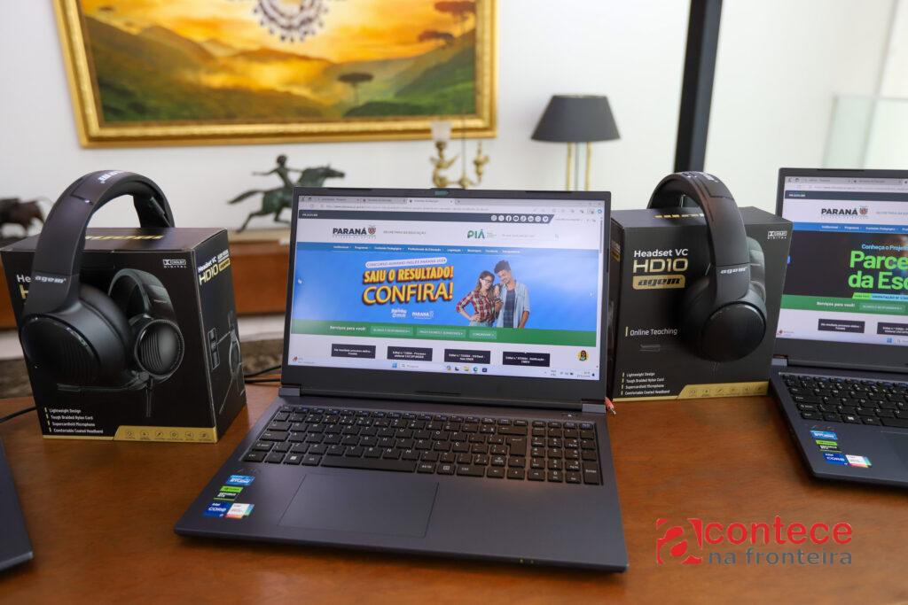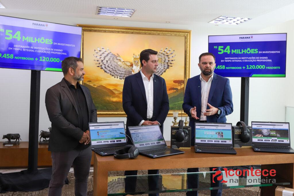 O Governo do Paraná, por meio da Secretaria da Educação (Seed), destina 9.458 notebooks para escolas da rede estadual que atendam em tempo integral e as profissionalizantes. Também estão sendo entregues 119.119 headsets (fone de ouvido com microfone integrado) para todos os colégios da rede estadual. O anúncio foi feito pelo governador Carlos Massa Ratinho Junior e o secretário da Educação, Roni Miranda, nesta terça-feira (19).