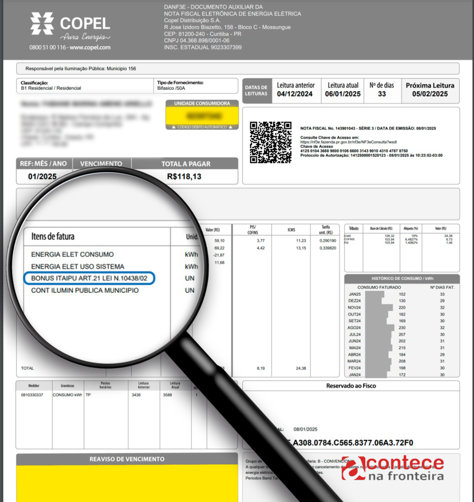 Mas como o cidadão pode saber se é um dos beneficiados pela medida? O desconto está discriminado na conta de luz emitida pelas distribuidoras, na aba “itens da fatura”, como “bônus Itaipu art.21, Lei n. 10438/02”. No mesmo campo o consumidor saberá exatamente qual o valor do benefício.