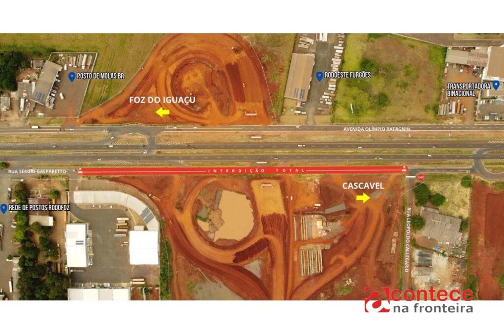 O tráfego da Rua Sérgio Gasparetto será desviado para a BR-277, na pista sentido Foz do Iguaçu – Cascavel, com ampla sinalização provisória no trecho orientando os usuários.
