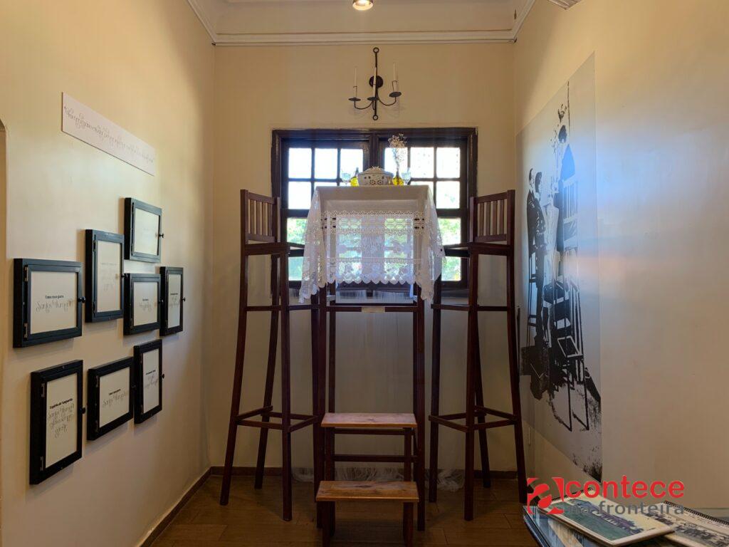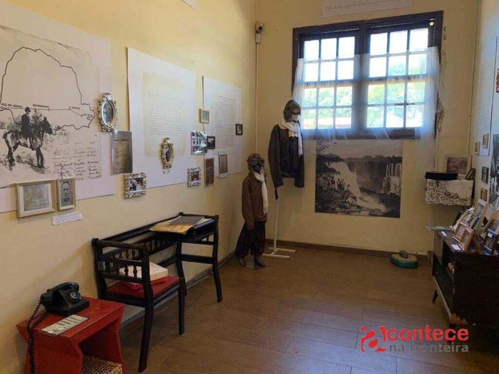 São duas salas temáticas. A primeira aborda a trajetória de vida do pai da aviação e curiosidades sobre os inventos dele. Na segunda sala, o enfoque é na passagem de Dumont por Foz do Iguaçu, em abril de 1916. Fotos, peças antigas originais e réplicas das máquinas voadoras desenhadas pelo aeronauta brasileiro estão expostas no espaço. “Sem dúvida, uma das atrações é a mesa de dois metros de altura com cadeiras altas, uma réplica da mesa que Santos Dumont tinha dentro do apartamento dele, em Paris, onde servia os ‘Jantares nas Alturas’,” conta Sílvia Scandalo, uma das voluntárias que mantém a exposição.