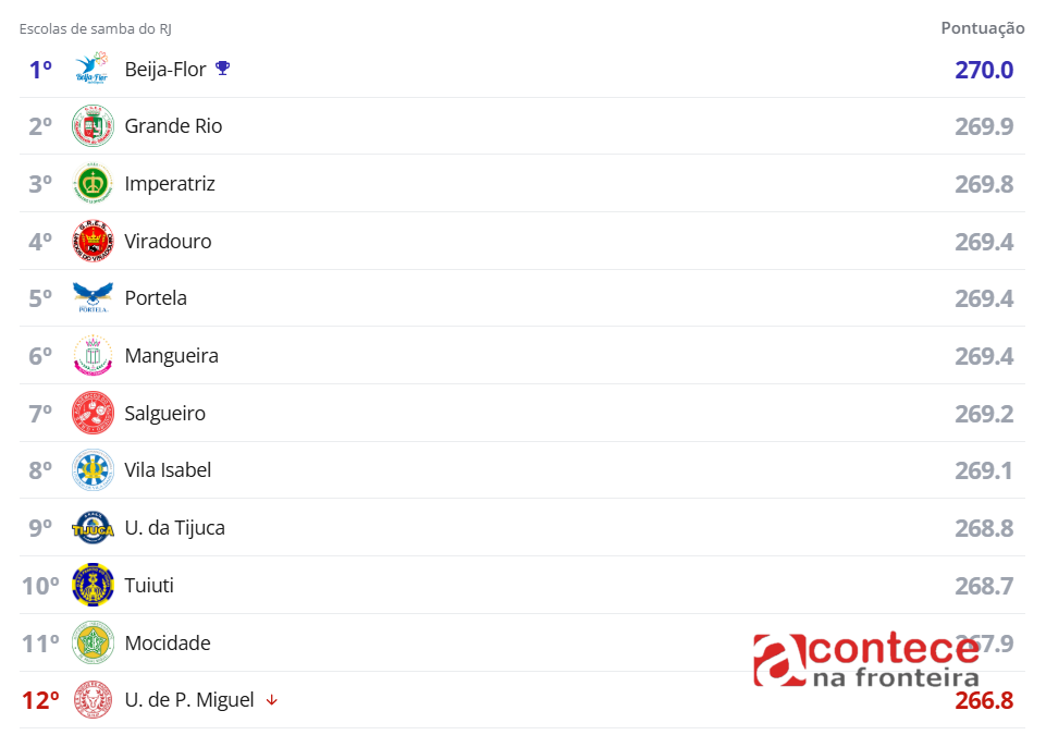 A Beija-Flor foi a campeã do Grupo Especial do carnaval 2025 no Rio de Janeiro. A Unidos do Padre Miguel foi rebaixada para série ouro.