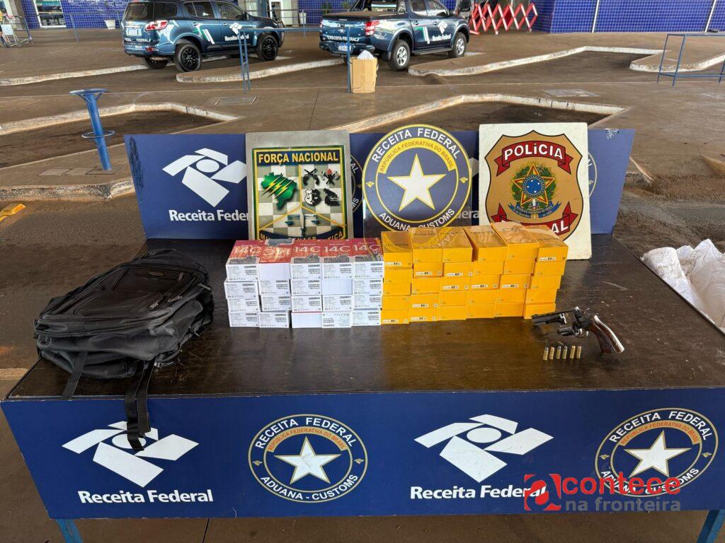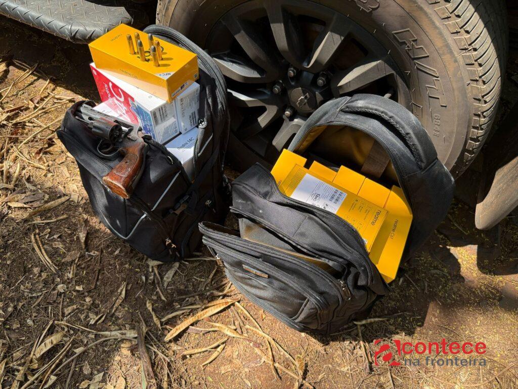 Quando representantes da Receita Federal, da Força Nacional e da Polícia Federal chegaram ao local indicado, já identificaram o menor com a arma de fogo engatilhada empunhada na mão direita e duas mochilas com as mercadorias na mão esquerda. Ele estava acompanhado de outra pessoa, que evadiu o local ao notar as forças de segurança.