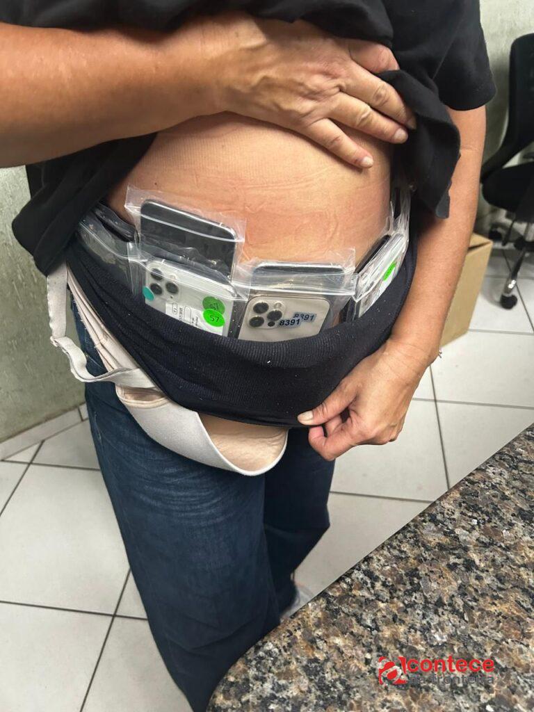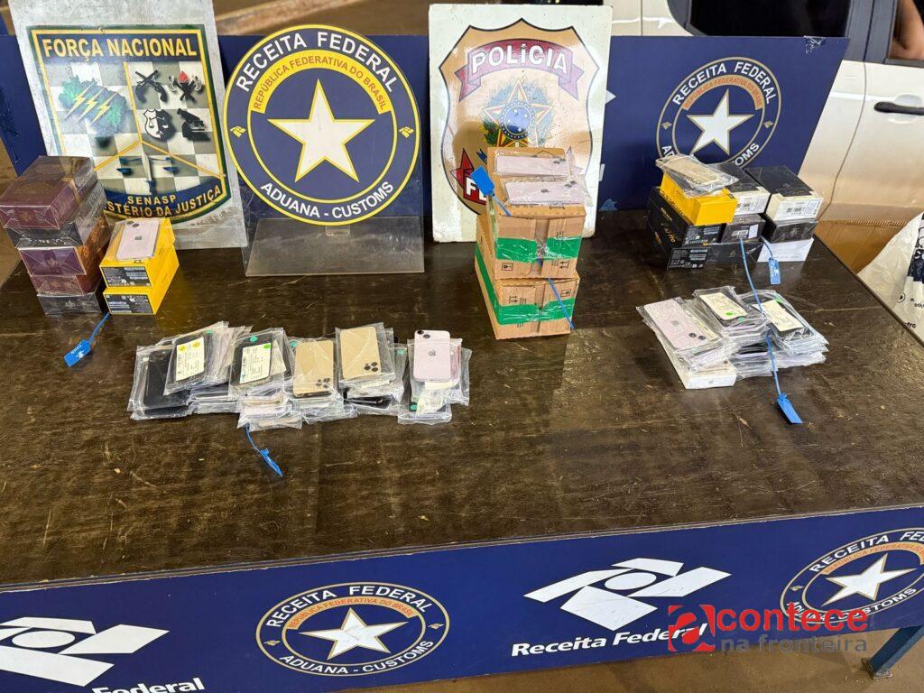 Servidores da Receita Federal realizavam abordagens de rotina na Ponte Internacional da Amizade, na quarta-feira (12), quando ocorreram duas grandes apreensões. A primeira abordagem aconteceu quando um veículo com cinco ocupantes que tentavam atravessar para o lado brasileiro foi parado para fiscalização. Durante a vistoria, os servidores descobriram que três das pessoas estavam transportando celulares de forma ilegal, presos ao corpo com fitas na cintura e nas pernas. O valor da carga apreendida foi de R$ 116 mil, referente a 80 celulares de diversas marcas.