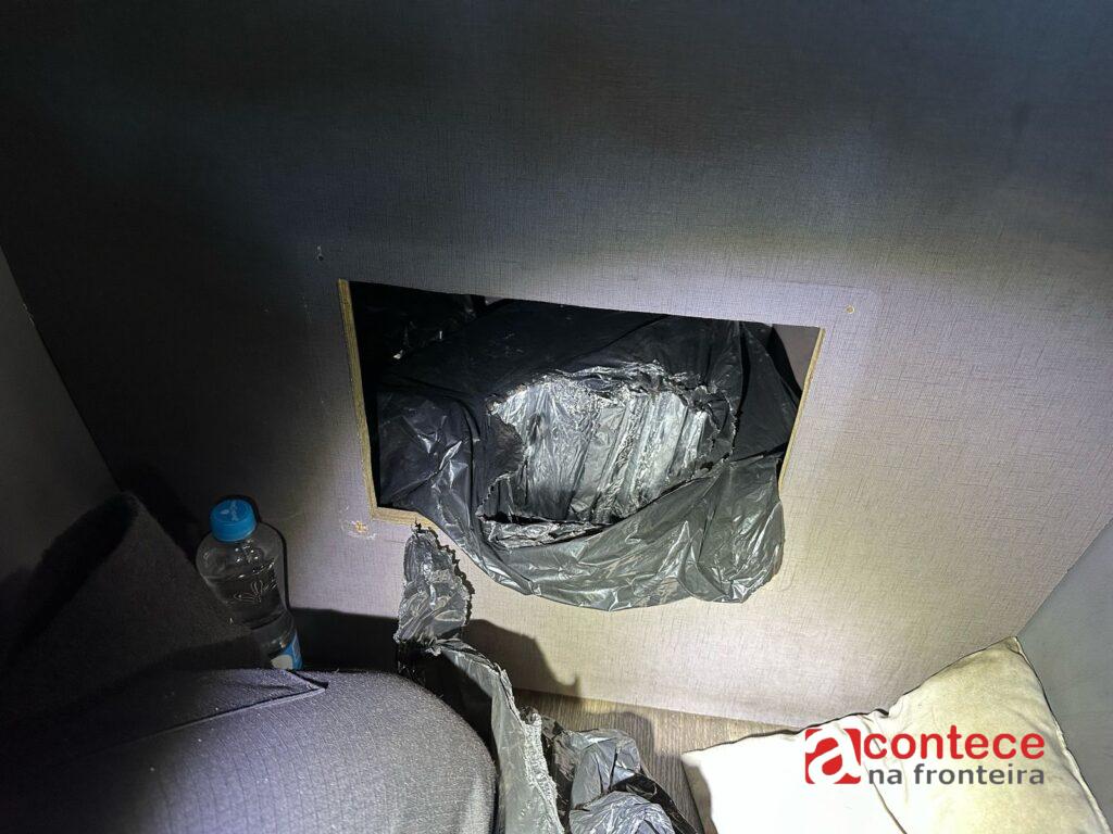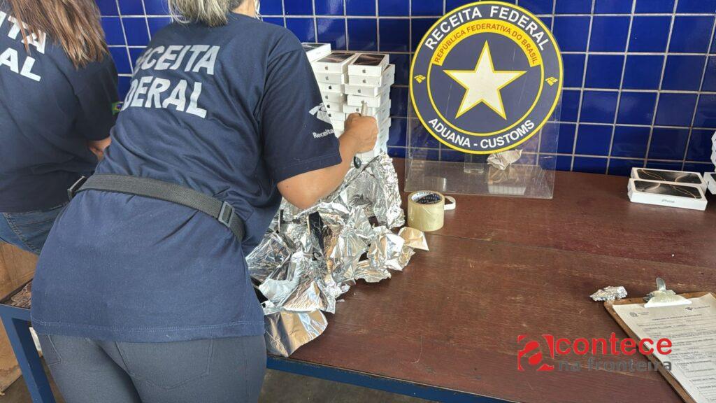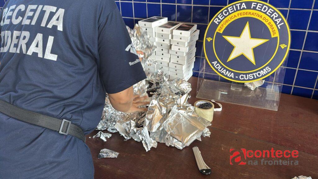 Cerca de R$ 500 mil em celulares e outros eletrônicos escondidos em fundos falsos dentro de um ônibus de linha com placas paraguaias foram apreendidos pela Receita Federal. O veículo seguia de Assunção (Paraguai) para São Paulo (SP) e foi parado durante uma fiscalização de rotina na Ponte Internacional da Amizade.