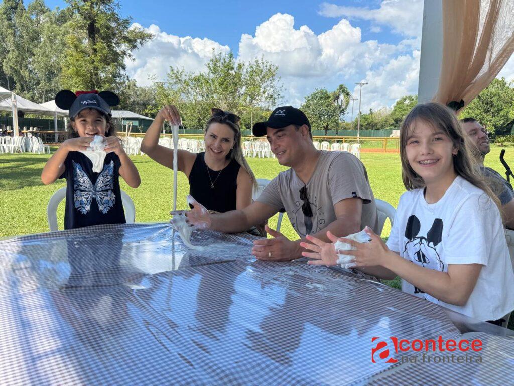 Além das apresentações tradicionais com as Aves de Rapina e o Cavalo, as famílias viveram experiências inéditas. “É a primeira vez que faço slime. Está sendo uma experiência única com as minhas filhas”, disse Igor Mussoi Lima ao lado das filhas Melissa, Beatriz e da mulher Melissa.