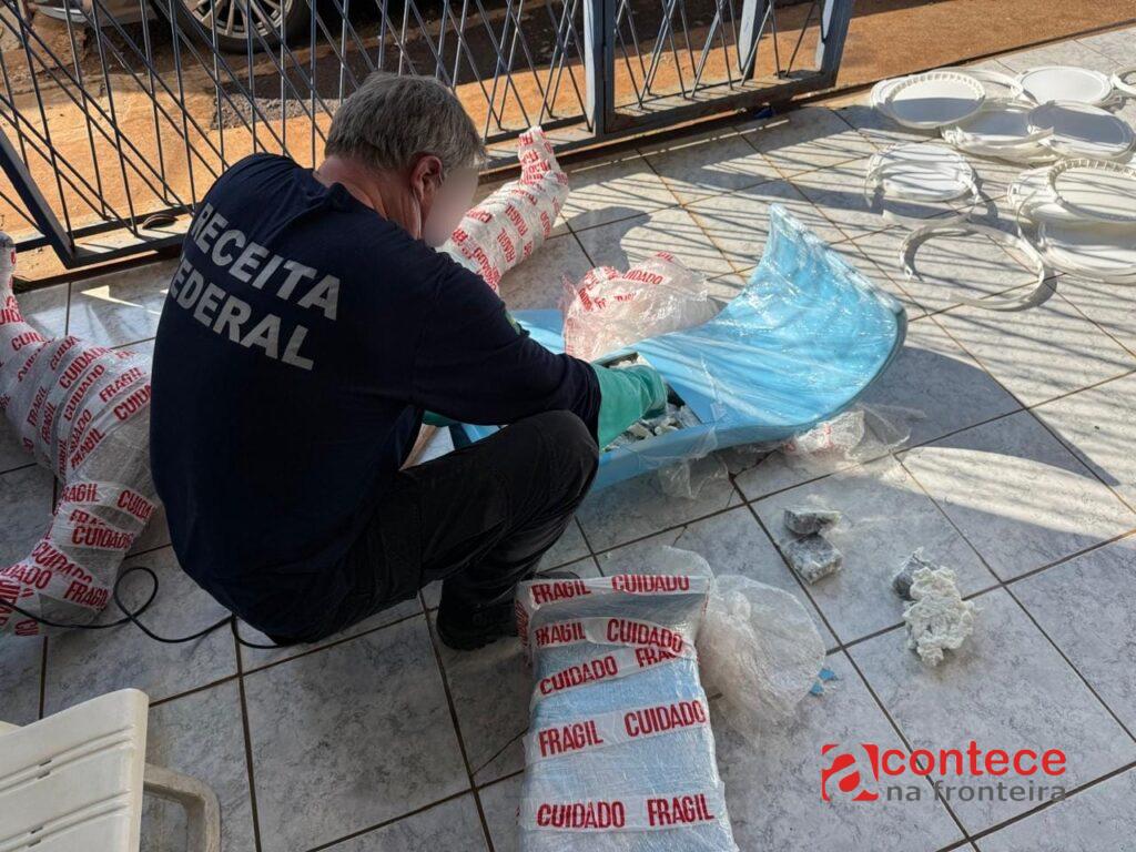 A droga foi encontrada oculta em baldes de cloro e acessórios para piscina, em carga que foi despachada de uma transportadora da cidade de Foz do Iguaçu/PR e tinha como destino a cidade de Cascavel/PR.