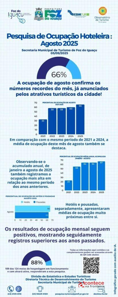 Foz do Iguaçu fechou o mês de agosto de 2025 com a taxa de ocupação hoteleira de 66%, superando os anos anteriores. A pesquisa de Ocupação Hoteleira, realizada pela Divisão de Estatística e Estudos Turísticos da Secretaria Municipal de Turismo, comprova os números recordes já anunciados pelos atrativos. No acumulado do ano, a cidade também atingiu a melhor marca anual em relação aos últimos anos.