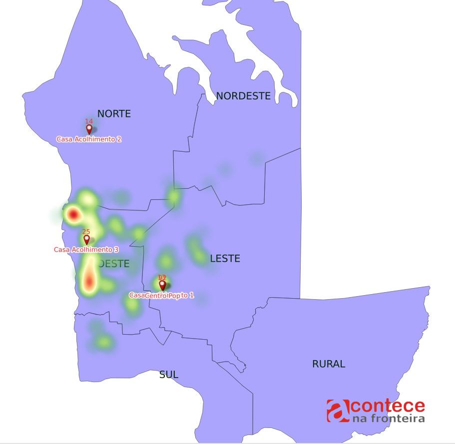 Na região norte, o levantamento identificou concentração menor, em torno da Casa de Acolhimento 2 (14 registros). Já as regiões Sul, Nordeste e Rural apresentaram baixa incidência, com poucos casos dispersos.