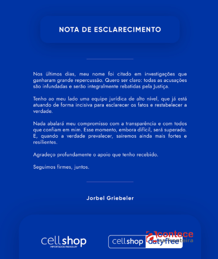 Após noticiado na imprensa sobre a decretação de prisão pela Vara Estadual de Organizações Criminosas da Comarca da Capital de Santa Catarina do empresário Jorbel Griebeler. A página da CELLSHOP, uma das empresas de Jorbel, emitiu uma nota oficial falando sobre o caso.