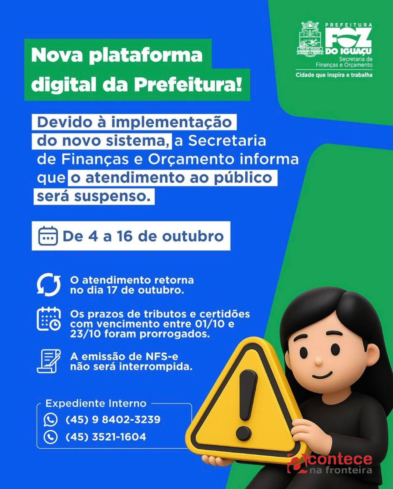 A Prefeitura de Foz do Iguaçu, por meio da Secretaria Municipal de Finanças e Orçamento, realizará, entre 6 e 17 de outubro, a migração dos dados para o novo sistema de gestão tributária OXY. Nesse período, os serviços tributários permanecerão temporariamente indisponíveis em todos os setores da Secretaria. O atendimento aos contribuintes será restrito a orientações e esclarecimentos prestados exclusivamente pelos canais eletrônicos (WhatsApp, e-mail e telefone).