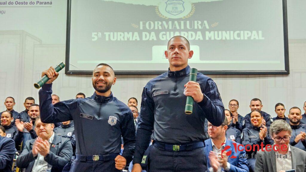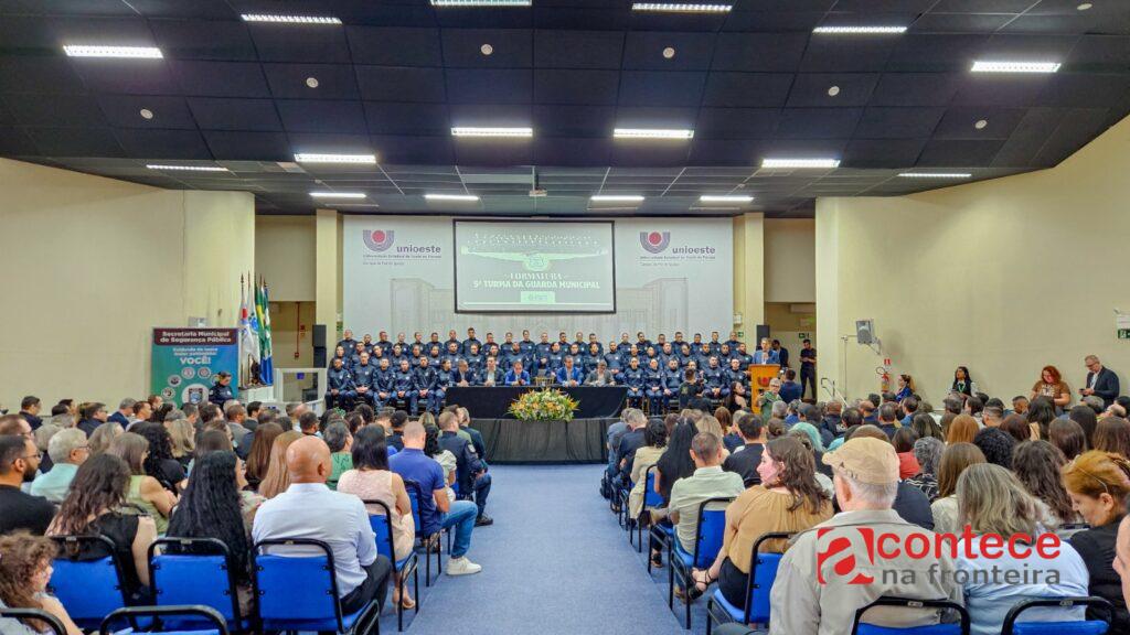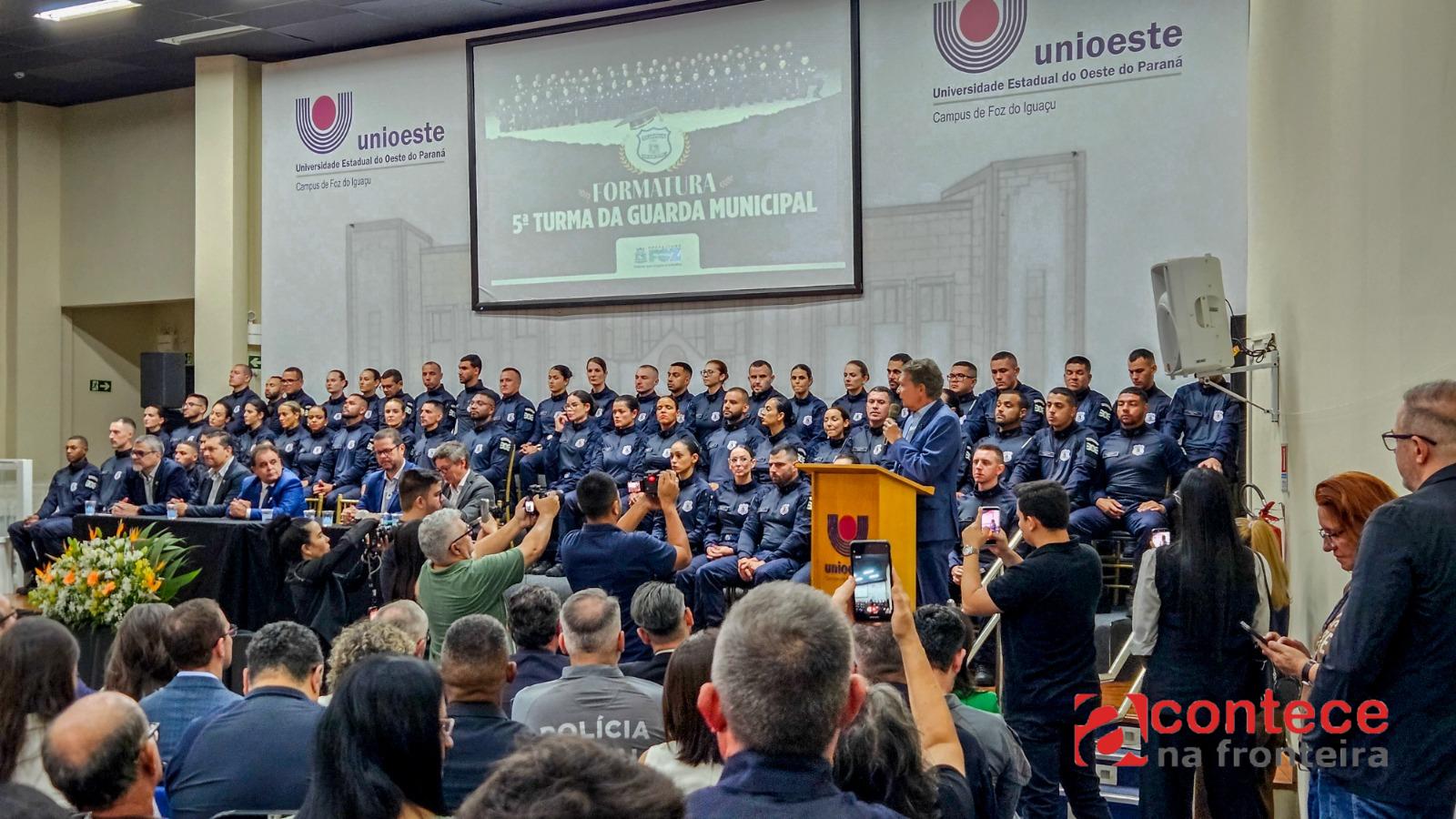 Na manhã desta sexta-feira, 24 de outubro, o auditório da Universidade Estadual do Oeste do Paraná (Unioeste) foi palco da formatura de 56 novos guardas municipais de Foz do Iguaçu. A cerimônia contou com a presença de autoridades de todas as esferas, do prefeito General Silva e Luna, do vice Ricardo Nascimento, do deputado estadual Batatinha, de secretários, vereadores e dos familiares dos novos GMs.