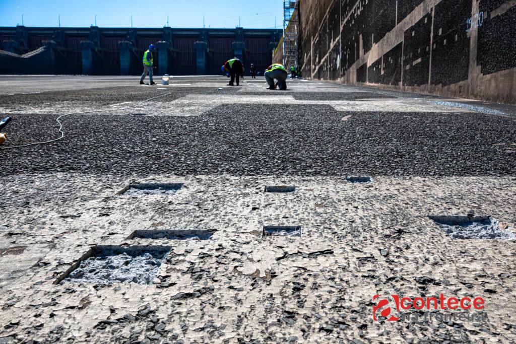 Um trabalho minucioso, envolvendo todas as áreas da Diretoria Técnica da Itaipu Binacional, encontrou e reparou mais de 3.500 pequenos pontos de erosão no vertedouro. A atividade, executada na calha esquerda, a maior das três calhas com mais de 62,3 mil metros quadrados de área, começou no início de julho e terminou na semana passada. O objetivo é manter a estrutura em excelentes condições operativas.