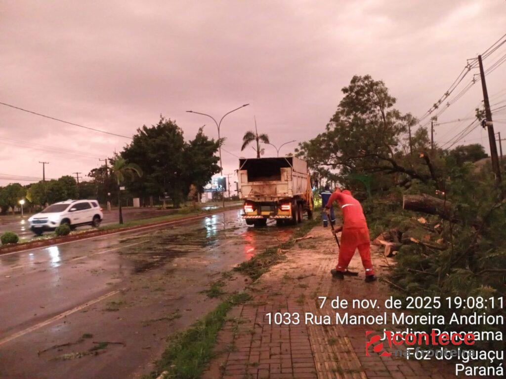 - Houve a queda de uma placa de publicidade às margens da Avenida das Cataratas que atingiu a rede elétrica, além de outras situações de cabos rompidos e danos em postes de energia elétrica.