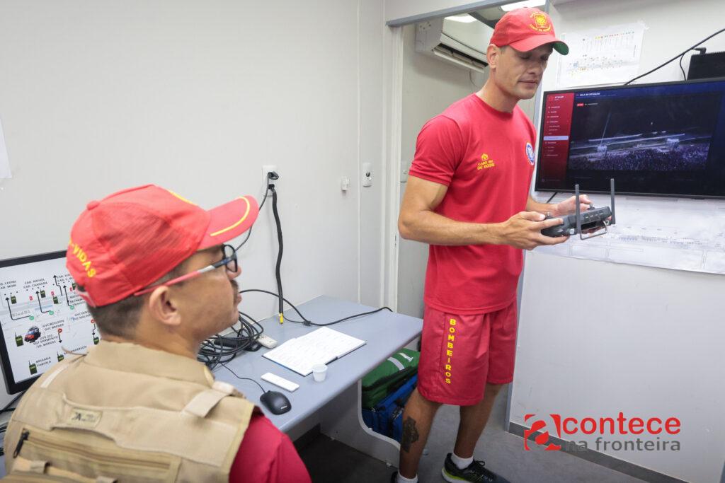 Coordenação é feita a partir do Posto de Comando Móvel do Corpo de Bombeiros ao lado do palco, de onde toda a logística da operação é planejada e executada.