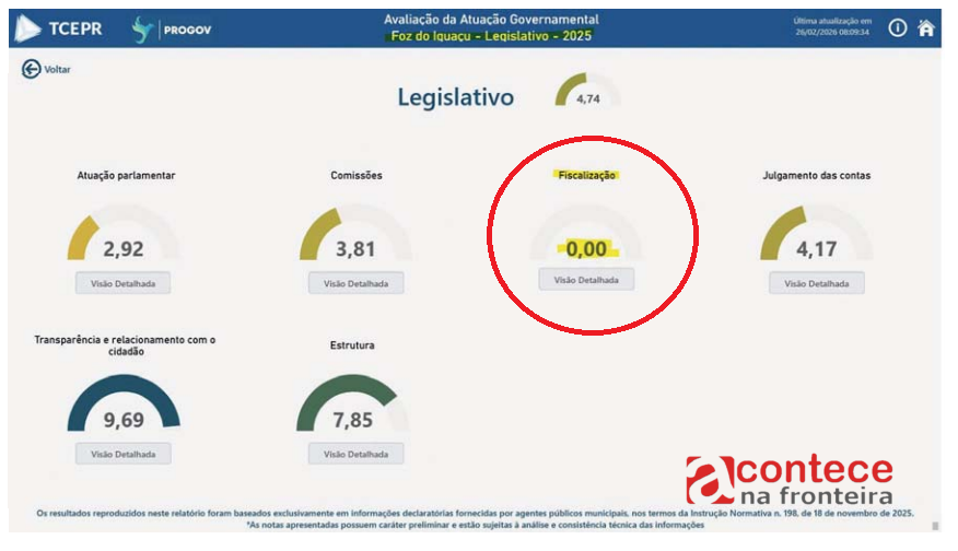 Segundo os dados do próprio TCE-PR, a Câmara não possui sequer um ato normativo que regulamente como deve fiscalizar. É como abrir uma escola sem currículo, um hospital sem protocolo ou um quartel sem ordem do dia. No formulário oficial, aparecem notas igualmente generosas em “Normatização da função fiscalizadora”, “Plano de Fiscalização” e “Execução das fiscalizações”. Traduzindo: não há regra, não há planejamento e não há prática. Talvez alguém tenha confundido requerimento protocolado com auditoria estruturada. Mandar um ofício perguntando “está tudo bem?” não substitui cronograma, metodologia, relatório técnico e acompanhamento contínuo. Fiscalizar não é apertar “enviar” no e-mail institucional; é abrir caixa-preta, cruzar dados, ouvir a sociedade, apontar falhas e cobrar correções. Sem integração com Ouvidoria, sem comissões atuantes e sem metas claras, o Legislativo iguaçuense parece ter transformado a fiscalização em peça de ficção administrativa. Existe no discurso, mas não no mundo real.